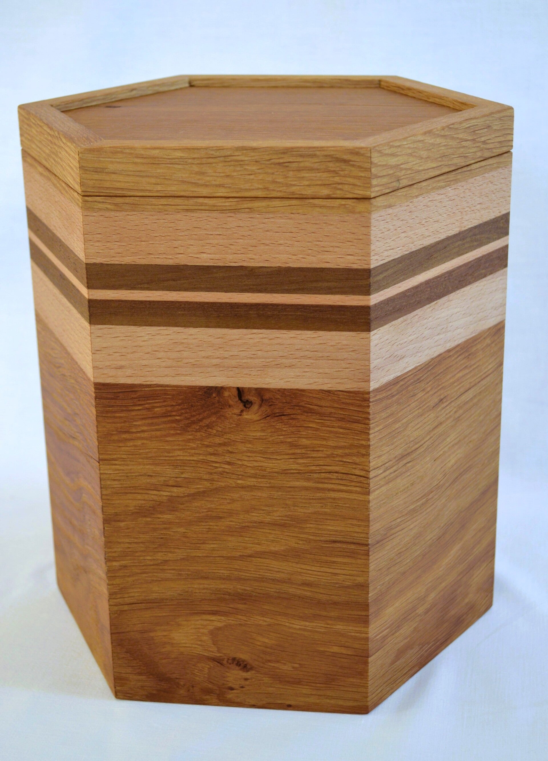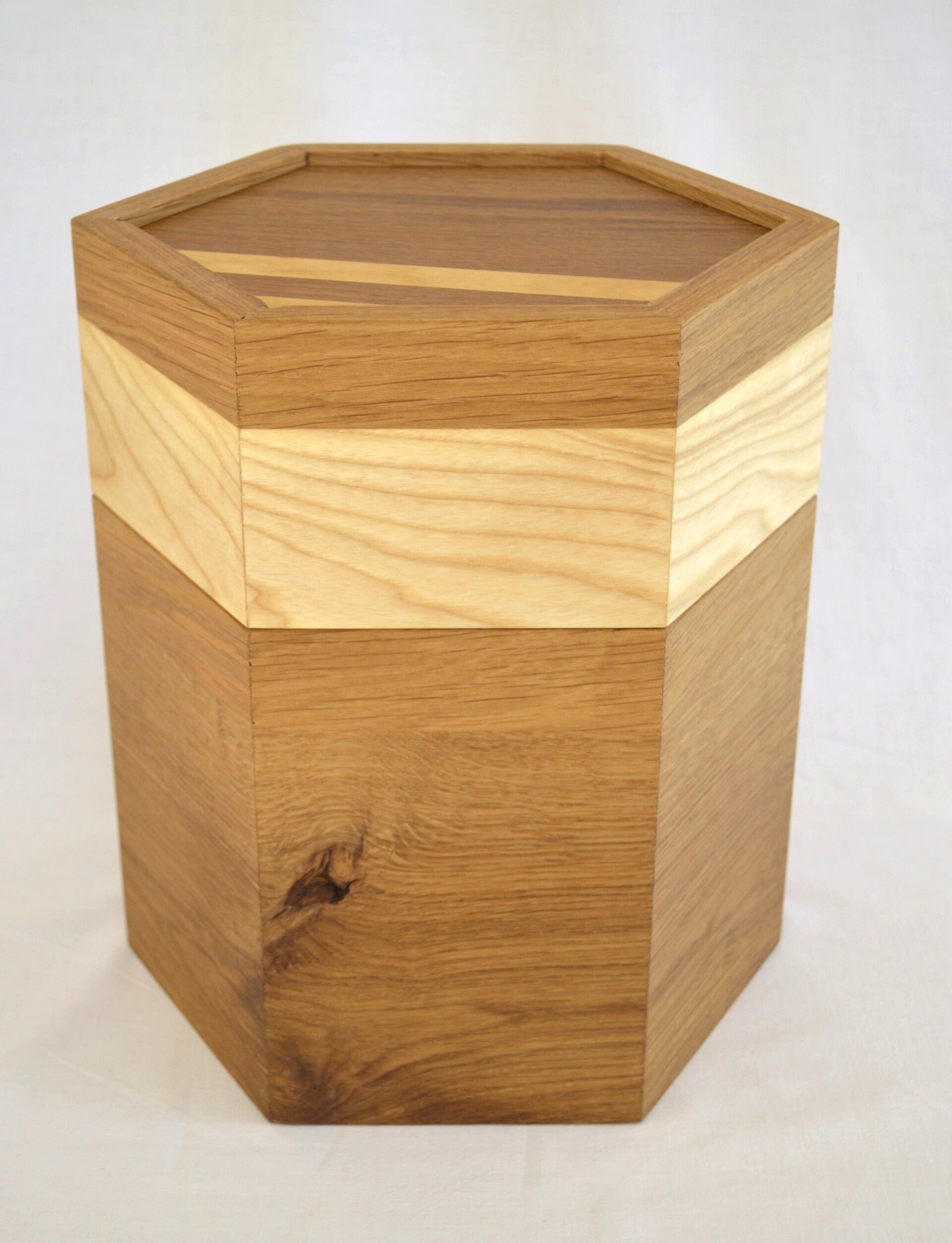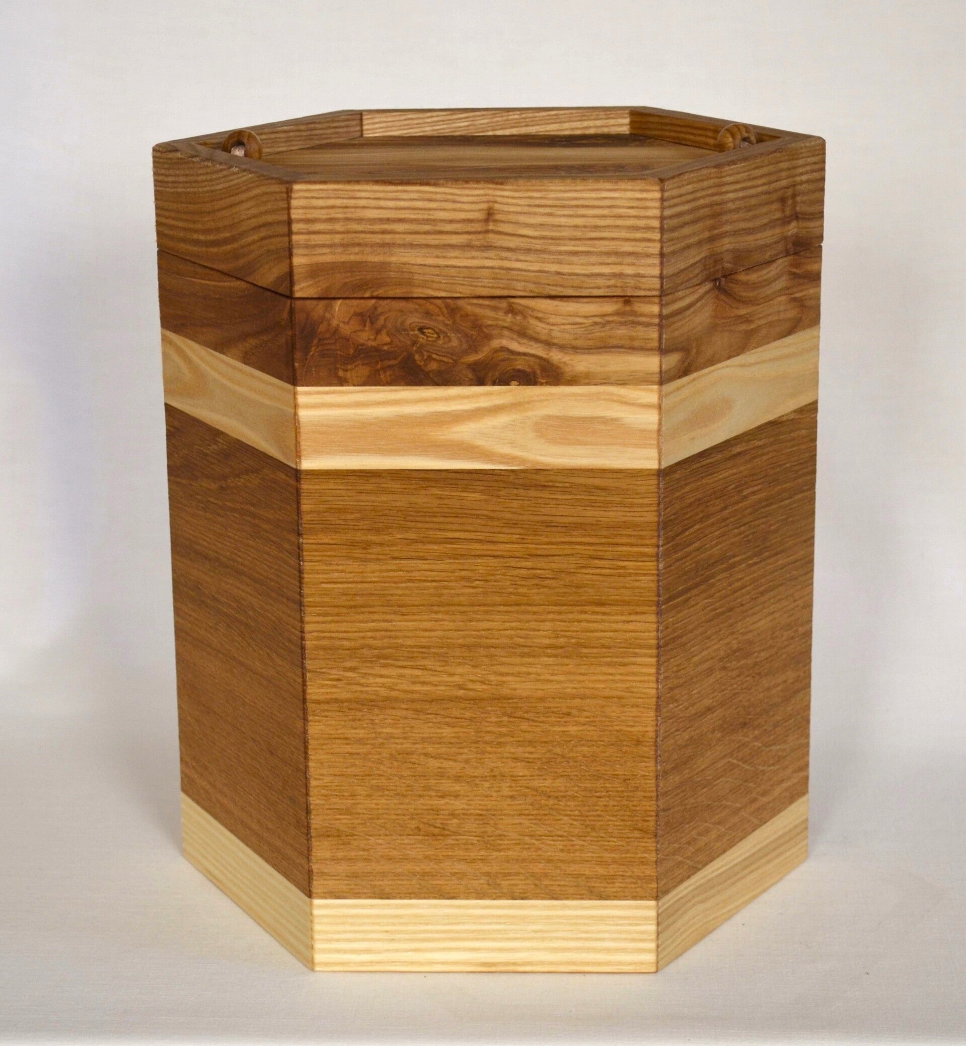 506 Urne aus Eichenholz einer Kirchenbank mit Esche und Streifen im Deckel